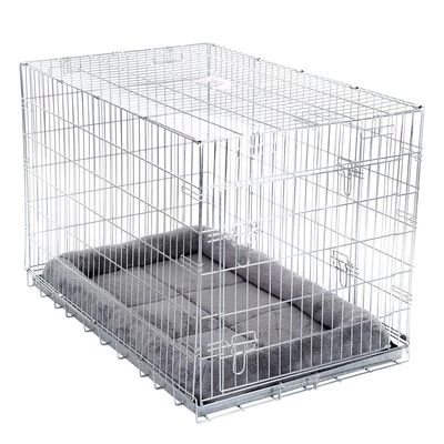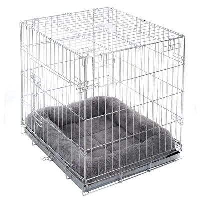 Cage confortable pliable avec coussin pour chien, fond et armatures zingués, avec 2 portes et des poignées pratiques, facile à nettoyer, disponible en plusieurs tailles.