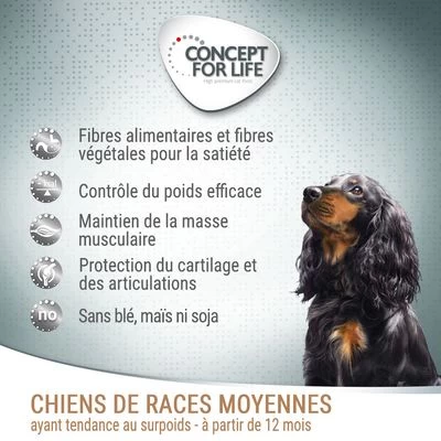 Les croquettes de grande qualité Concept for Life Medium Light ont été spécialement élaborées d’après les dernières connaissances scientifiques pour répondre aux besoins des chiens adultes de races moyennes en situation de surpoids :