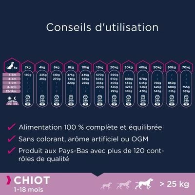 - croquettes de qualité pour les chiots de grandes races (25-40 kg) âgés de 1 à 12 mois et de très grandes races (> 40 kg) âgés de 1 à 24 mois