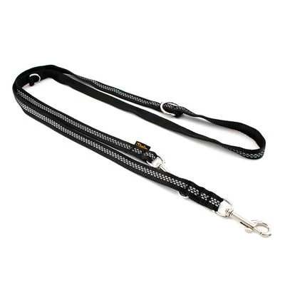 Lorsque vous vous promenez avec votre chien dans la pénombre, il est important de vous faire voir des autres usagers de la route. Avec ses éléments réfléchissants cousus dans le tissu, la laisse Heim a été fabriquée à cette fin. Réglable en trois points, vous pourrez choisir la longueur de laisse en fonction de la situation et la raccourcir rapidement si besoin.