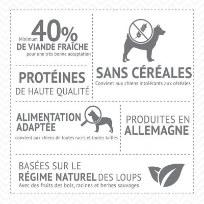 Lot de croquettes pour chiens sans céréales à base d’une source de protéine unique, recettes naturelles à base de 40 % de viande fraîche, basées sur l’alimentation du loup à l’état sauvage.