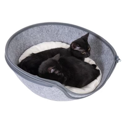 Grande niche en feutre pour chat et petit chien, s’ouvre à l’aide d’une fermeture-éclair, coque du dessus amovible, fournie avec un coussin amovible, protège contre les courants d’air. Coloris : gris.