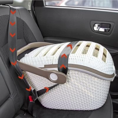 Panier de transport aspect rotin pour chat et petit chien, peut être attaché sur un siège de voiture avec la ceinture de sécurité, grand couvercle, petites ouvertures pour donner des récompenses.
