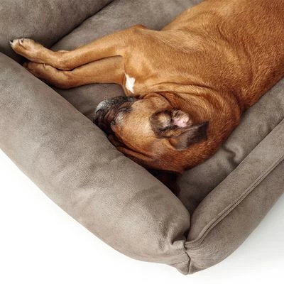Joli panier rectangulaire pour chien, housse en cuir synthétique toute douce, rebord moelleusement rembourré, entrée abaissée, coussin solidement cousu, ne glisse pas, facile d’entretien et résistant. Coloris : gris pierre