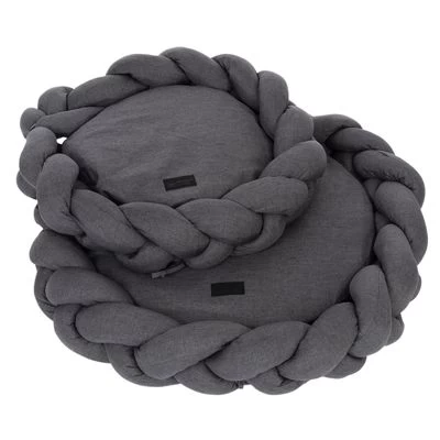 Panier rond pour chien, surface de couchage rembourrée épaisse, rebord tressé pour poser la tête, coussin intérieur amovible, lavable en machine, bord amovible. Coloris : gris foncé.