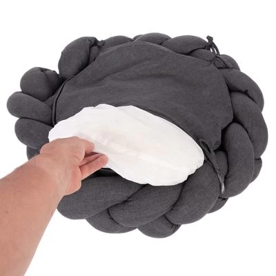Le coussin intérieur amovible permet un nettoyage simple et hygiénique de sa housse dans la machine à laver. De plus, son joli bord tressé, également amovible, s’attache facilement au coussin à l’aide de bandelettes prévues à cet effet. Avec son design moderne et sa construction robuste, ce panier allie à la fois style et confort.
