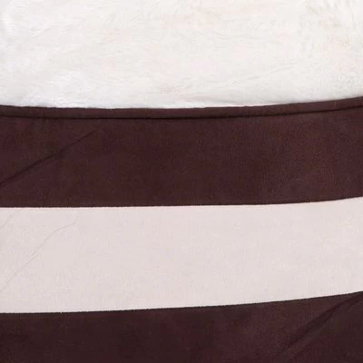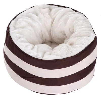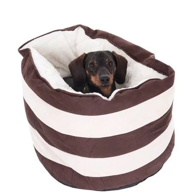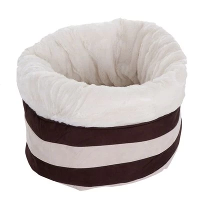 L’intérieur et la surface de couchage sont bien rembourrés et recouverts d’une peluche très douce. L’extérieur du panier est orné d’un joli motif rayé de couleur marron foncé et crème en imitation velours.