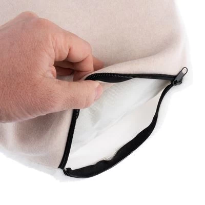 - avec coussin réversible : coussin amovible avec housse lavable, 1 côté en tissu d’ameublement et 1 côté en peluche douillette