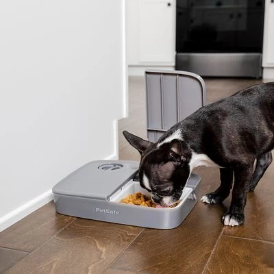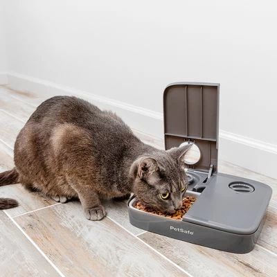 Sa conception sûre empêche les petits curieux d’ouvrir les couvercles avant l’heure. Le distributeur automatique PetSafe® possède deux compartiments d’une capacité de 355 mL chacun que vous pourrez remplir de nourriture semi-humide ou sèche. Les écuelles sont amovibles et passent au lave-vaisselle pour être nettoyées. Le distributeur automatique de nourriture pour 2 repas de PetSafe® fonctionne sur piles et peut donc être placé dans n’importe quelle pièce de la maison.