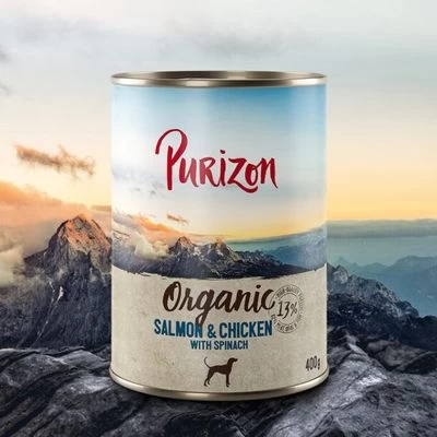 Les boîtes Purizon pour chien existent aussi désormais en bio : avec de la viande, du poisson et des abats de qualité bio, agrémentés de fruits et légumes bio, sans céréales, riches en protéines.