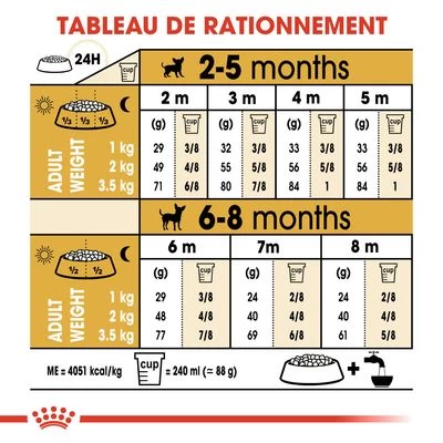 De par sa taille, le chihuahua est la plus petite race de chiens au monde. Sa petite taille en fait un chien de compagnie très apprécié qui passe le plus clair de son temps en intérieur. Doté d’une morphologie compacte, le chihuahua se montre agile, attentif et dynamique. Pendant la phase sensible de sa croissance, le jeune chihuahua a besoin d’une alimentation spécifique qui répond à ses exigences nutritionnelles. Les croquettes Royal Canin Chihuahua Puppy ont été élaborées pour les chiots de cette race jusqu’à 8 mois. Ces croquettes ont des teneurs élevées en protéines et énergie pour fournir à cette race de chien dynamique toute l’énergie dont elle a besoin. Le complexe d’antioxydants à base de vitamine E aide à renforcer les défenses immunitaires naturelles. Ces croquettes contiennent des nutriments et des protéines sélectionnés particulièrement digestes afin de favoriser la digestion et de réduire la quantité et l’odeur des selles. Cet aliment au goût savoureux présente une haute appétence. Ces croquettes sont adaptées à la très petite mâchoire des chihuahuas en période de croissance pour faciliter la préhension alimentaire et encourager la mastication.