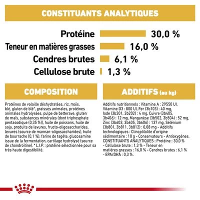 - maintien de la masse musculaire : teneur en protéines adaptée pour favoriser la musculature et le poids de forme