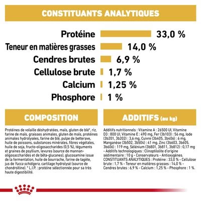 - santé des os et des articulations : teneurs en calacium et en phosphore adaptées pour favoriser la construction osseuse