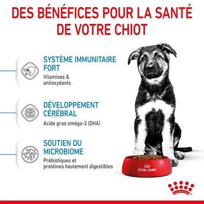 Nouvelle recette ! Croquettes complètes pour les chiots de grandes races de 2 à 15 mois, favorisent une bonne croissance et l’équilibre de la flore intestinale, renforcent le système immunitaire.