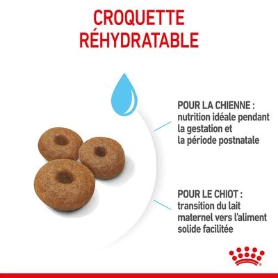 Les croquettes Royal Canin Maxi Starter Mother & Babydog sont facilement réhydratables et permettent ainsi de préparer une délicieuse bouillie pour aider les chiots à se sevrer du lait maternel.