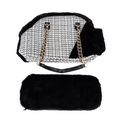 Joli sac bandoulière pour chiot et petit chien jusqu’à 3,5 kg, mélange de tweed et peluche, coussin amovible, compartiment intérieur, sangle réglable, laisse courte intégrée, mousqueton. Coloris : noir,/blanc