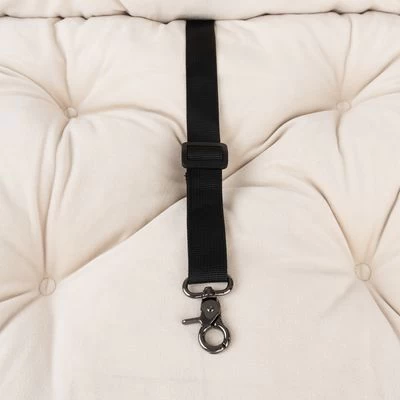 Siège de voiture confortable pour petit chien, adapté au siège avant, design de qualité, surface d’assise et dossier confortables, avec surpiqûres, laisse courte incluse, en polyester recyclé.